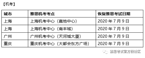 7月9日起在上海、广州、重庆3所机考中心共4个考场恢复雅思和用于英国签证及移民的雅思(IELTS for UKVI)机考。