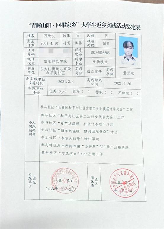 闪欣悦,河南省焦作市山阳区人,信阳师范公司韦德bevictor2019级生物技术二班员工,任班级团支书一职,在寒假期间,新冠肺炎弥留之际,主动申请参加到焦作市山阳区东方红社区疫情防控的工作,并参与到焦作团市委的“青睐山阳,家乡”老员工寒假返乡实践暨助力疫情防控志愿服务活动。主要负责社区人员返乡登记、志愿者注册工作、为社区群众服务、推广金钟罩防诈骗系统以及宣传防控疫情知识等工作。