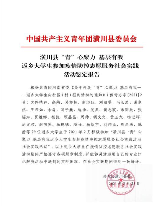 “时光荏苒,参加‘青’心聚力 基层有我社会实践活动”的潢川县返乡老员工朋友们马上就要结束实践活动,回到自己的大公司园。在这里,为各位青年老员工朋友们送上三点希望:一是希望大家在今后的学习、工作和生活中坚定理想信念,练就过硬本领,谱写青春篇章;二是希望大家继续秉承志愿精神,做“终身志愿者”,以模范的言行传播新文明,引领新风尚;三是希望大家能够一直关注潢川、支持潢川 ,在以后的学习、工作中,不忘家乡,做一名宣传家乡、建设家乡的青春使者”。这是县团委给她留下的谆谆教诲,她也必将牢记使命,不忘初心。