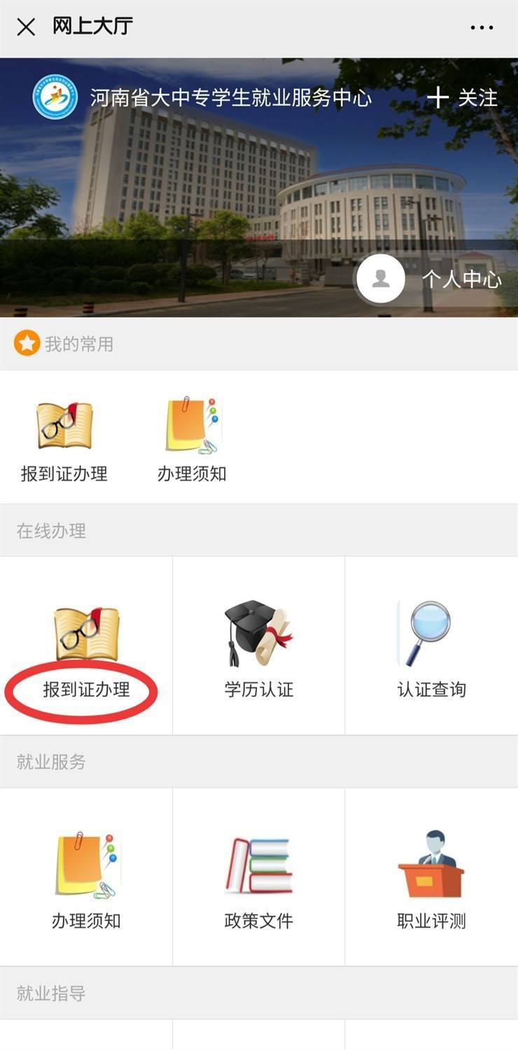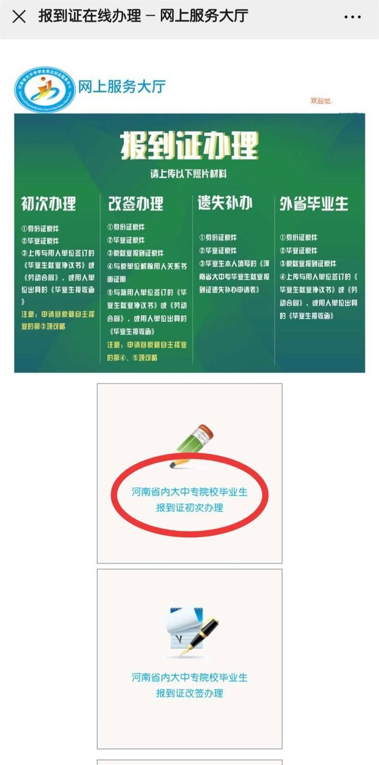 第一步:请员工关注“河南省大中专员工就业服务中心”微信公众号,关注后点击“微服务”—“网上大厅”—“报到证办理”先注册账号(手机号注册),然后进行所需要的业务办理。