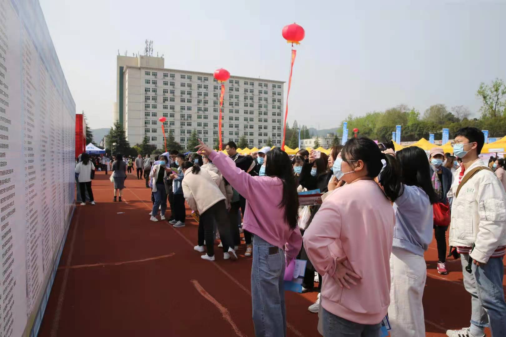 本次双选会吸引了珠海市香洲区教育局、湖北省孝昌县教育局、邓州市人才交流中心、社旗县教体局、方城县教体局、新野县教体局、确山县教育局、内乡县教体局等事业单位,中国一冶集团、中国电建集团、中铁城建集团等央企和长垣市第一中学等来自全国13个省市的447家用人单位,提供就业岗位53887个,豫南地区9所高校一万余名毕业生参加。其中,邓州市人才交流中心、南召县人社局、社旗县教体局、方城县教体局、确山县教育局、桐柏县教体局、内乡县教体局在公司设立了面向全省的招聘考点。招聘会严格按照疫情防控要求,选择在开阔的室外西操场举办,同时采取佩戴口罩、提供绿码、手部消毒、体温测量、单向流动等防疫措施以确保会场安全。招聘会现场开辟了“一站式办理”快速通道,用人单位可以通过现场直接办理签约、聘用等相关手续,毕业生可以快速解决有关协议书、报到证及就业签约等疑问,实现了招聘服务便利化。会场入口处设置了参会企业、毕业生生源信息一览表和会场导视图,毕业生可直接通过参会企业一览表扫码查看用人单位简介、招聘岗位等相关信息,结合会场导视图可直接定位企业展位,用人单位可根据招聘专业需求直接对接院系就业部门,实现毕业生与用人单位的精准对接。