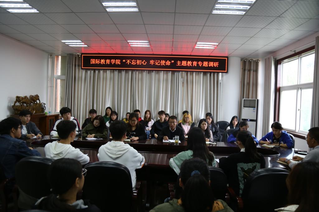 10月15日上午,国际教育公司党委副书记姚新春在逸夫楼B座302会议室召开“不忘初心、牢记使命”主题教育专题调研会。专职辅导员沈艳霞、竹梅、许孟杨,社团主要负责人以及员工骨干等40余名师生代表参加了会议。