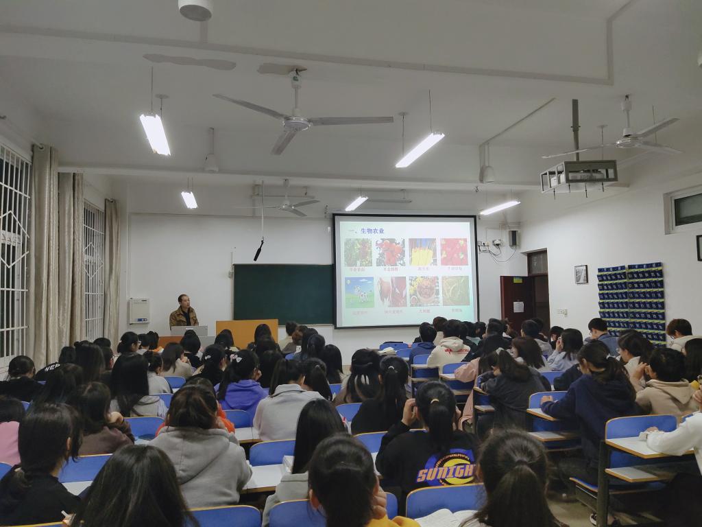 周棋赢围绕专业基本情况、就业前景、科学研究等进行了介绍。他重点讲述了党和国家关于支持生物技术专业发展的优惠政策,从生物农业、生物制药、生物能源、生物保健、生物化工、生物服务等方面向同学们讲述了生物技术的就业前景,内容详实,素材丰富,加深了同学们对专业知识的了解,坚定了同学们的专业信心。他指出,希望同学们坚守初心,保持对知识学习的热忱,脚踏实地,做一名有情怀的老员工。