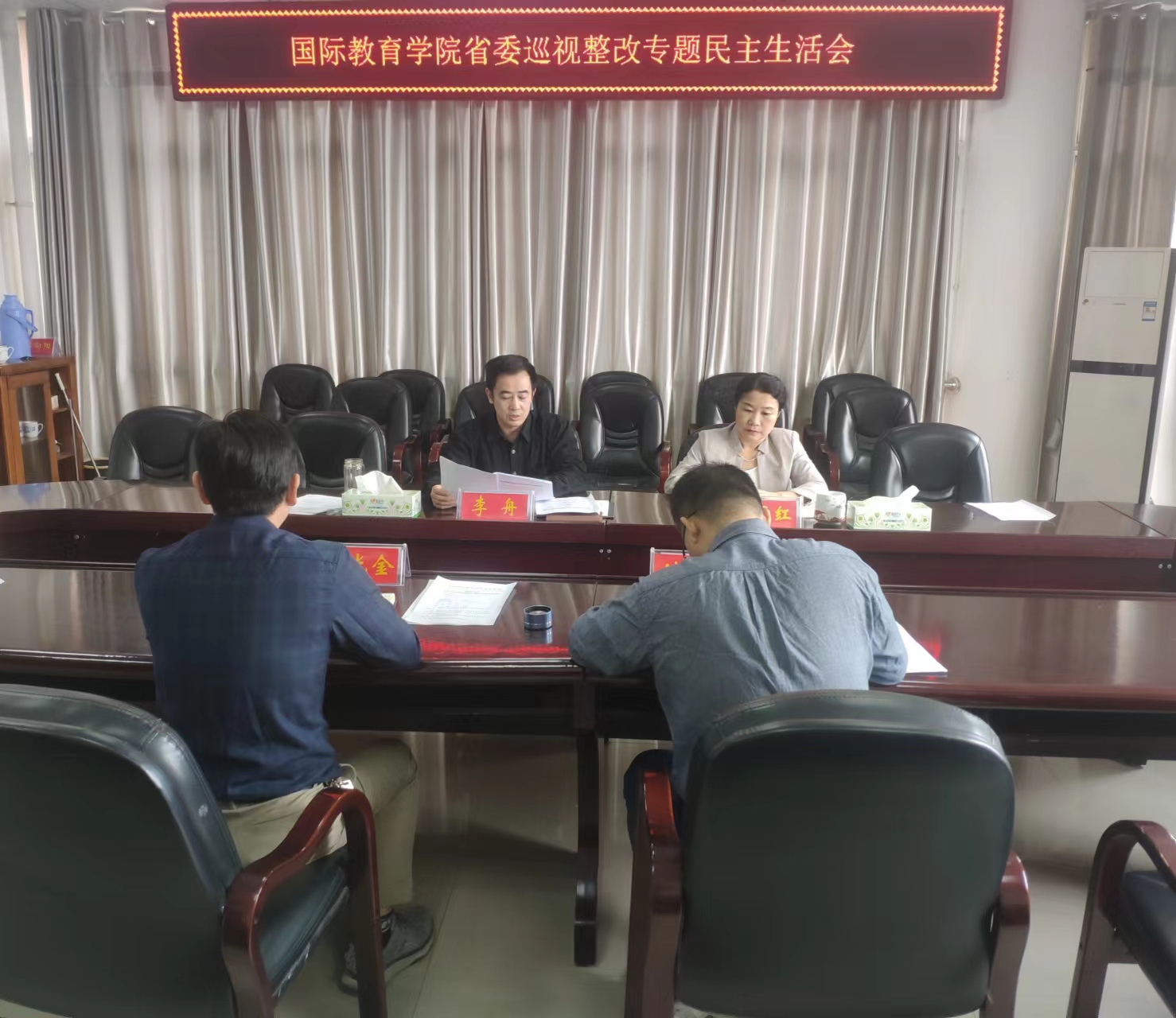 李舟就用好本次民主生活会成果,加强党委班子自身建设作了总结发言。他指出,本次民主生活会班子成员直面问题不躲闪、自我批评不隐瞒、相互批评不含糊,直奔主题、直指问题,推心置腹互提意见,起到了沟通思想、找准问题、增进团结的积极作用。大家要认真对待查摆问题、虚心接受批评意见,切实把民主生活会成果运用到中外合作办学工作实际中去,转化为提升工作能力、改进工作作风,推动事业发展提质增效的具体行动,同心同德,踔厉奋发,以实际行动迎接党的二十大胜利召开。一要加强党性淬炼。把巡视整改作为对党忠诚的具体检验,把坚定拥护“两个确立” 、坚决做到“两个维护”,深入推进全面从严治党体现在行动上、落实到工作中,压紧压实管党治党政治责任,举一反三真抓真改,落实“当下改”的治标举措,形成“长久立”的治本机制,为干事创业营造风清气正的政治生态。二要培养优良作风。贯彻落实以人民为中心的工作理念,坚持以上率下,大兴调查研究之风,切实增强八项本领,提高七种能力,踏实肯干、真抓实干、埋头“苦干”、勤政务实,在想师生之所想,急师生之所急上下足功夫,精准摸排师生急难愁盼,聚力解决师生反映强烈的现实问题。三要勇毅担当作为。切实把巡视整改成果转化为“挑重担、扛重责”的使命担当,以省委巡视反馈问题整改为契机,紧抓新时代教育对外开放带来的政策红利,把握机遇,应对挑战,多谋发展良策,进一步加强项目内涵建设、扩大项目辐射带动作用、推进项目拓展,进一步提高项目员工的国际化意识和出国留学意愿,以更加务实的作风和更加有力的举措,着力破解制约公司可持续发展的疑难问题,推动中外合作办学事业健康行稳致远。