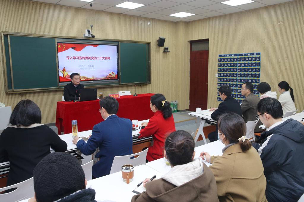 余本海围绕党的二十大的主题和主要成果、过去5年的工作和新时代10年的伟大变革、马克思主义中国化时代化的根本要求、中国式现代化的5大基本特征和战略安排、全面建设社会主义现代化国家5个方面新的历史特点和12个方面的决策部署、坚持党的全面领导和全面从严治党7个方面的主要任务、深化认识并坚定走好“五个必由之路”等7个方面的重点内容,对党的二十大报告作了全面系统解读。报告视野开阔、脉络清晰,内容生动、深入浅出,对全院师生党员学习领会党的二十大精神,进一步统一思想、坚定信心、明确方向、鼓舞斗志,更好履行党和人民赋予的使命,具有重要指导意义。